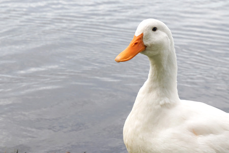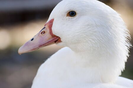 A closeup of a white duck on a blurred background