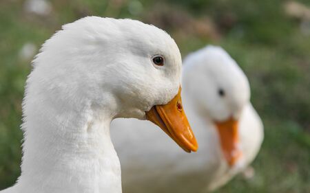 Photos pair of white ducks outdoors closeup