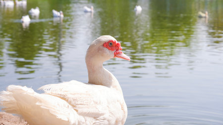 A barbary duck standing by a large pond with group of ducks swimming in livestock farm.