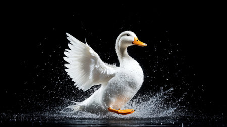 A stunning white duck splashes joyfully in the water, showcasing its beautiful wings and vibrant feathers. An enchanting moment of wildlife in action.