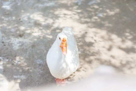 White goose standing on the ground in the park, closeup of photo