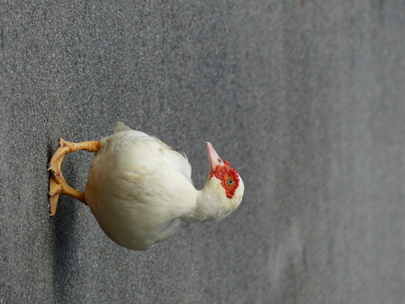 Duck looking for grains while walking in paddock on farm