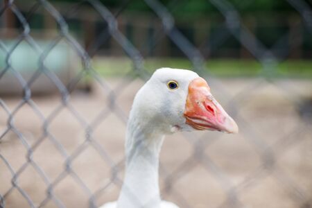 geese behind the fence. close-up portrait of a goose