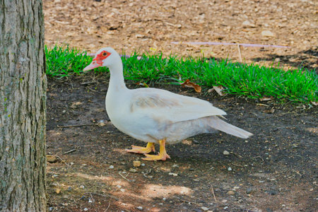 white duck standing on the ground in the park, close-up