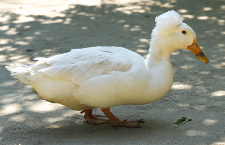 Close side view of a white Pekin crested duck showing detailed feathers and rounded body. The bird stands on textured ground with soft shadow patterns.