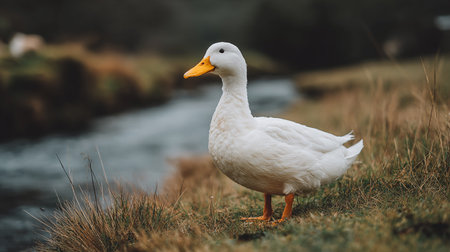 White duck standing on the grass near the river in Scotland, UK