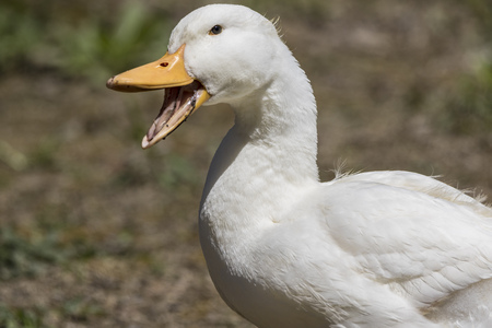 A white pekin duck quacking up a storm.