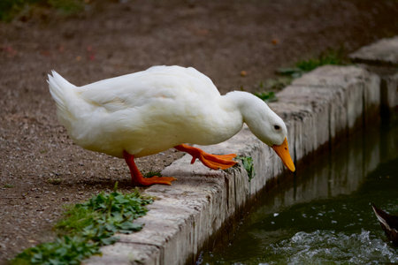 A closeup of a cute American Pekin preparing to get into a pond in the daylight with a blurry background