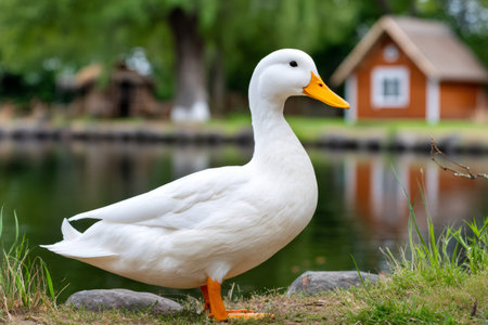 White domestic duck standing on green grass next to a pond with a small house in the background