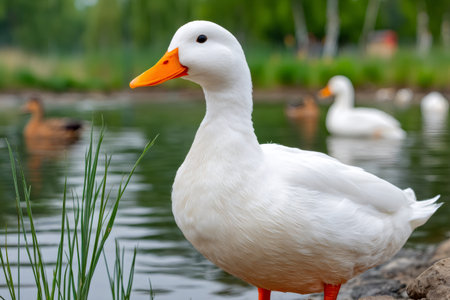 White duck standing by the pond's edge with other ducks in the background