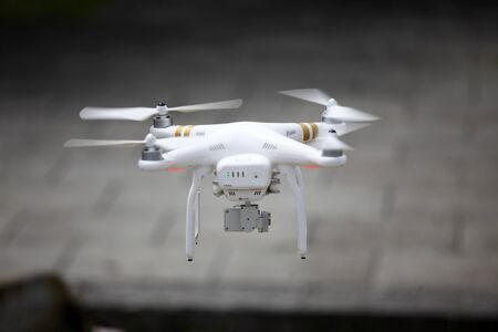 White drone, quadrocopter with photo camera flying concept on the sky.