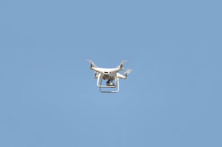 White copter in the sky isolated. Copter with a camera on the background of a blue sky. The flight of the copter. Video shooting from the sky. Modern technology for photo, video shooting