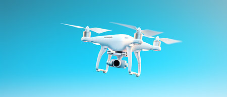 A flying drone banner. Airborne quadcopter. Also known as a drone or UAV, Unmanned Aerial Vehicle. Drone with camera on a colorful blue background with copy space.