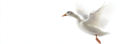 A duck is captured in a playful moment, jumping with its wings spread, conveying a sense of humor and lightness in a bright, white setting.