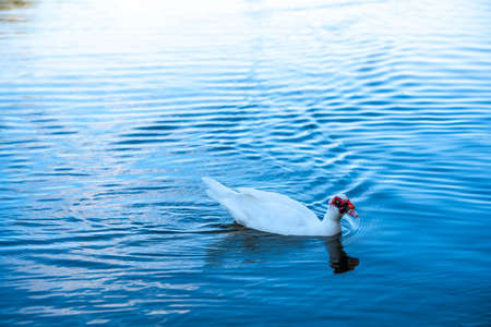 White duck swimming in a blue lake