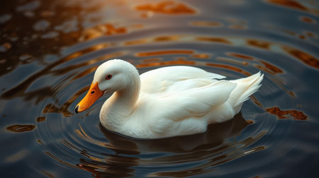 White duck swimming peacefully in calm water during sunset in a serene natural setting