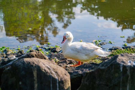 White duck standing on rocks by the tranquil waters of a pond during sunny daylight hours