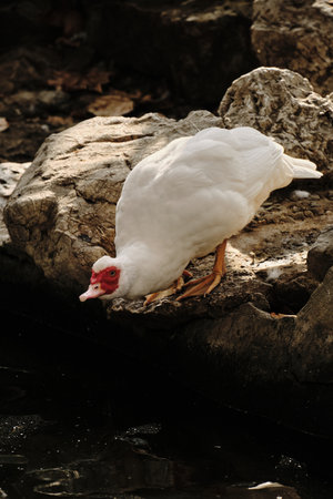 A white Muscovy duck bends down from rocks to drink water in the shaded pond