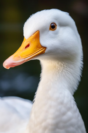 A closeup of a white duck on a blurred background