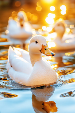 Soft sunlight bathes the tranquil pond as ducks glide effortlessly across the water, their shiny white feathers reflecting the golden hues of the evening. A peaceful moment in nature.