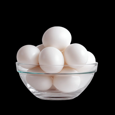A clear bowl filled with fresh white eggs sits against a black background, highlighting their smooth surfaces and simplicity. Ideal for culinary inspiration.