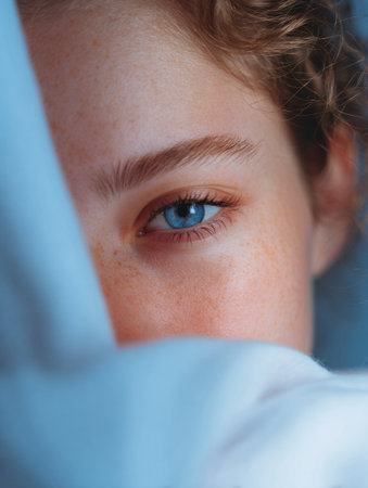 Tired eyes express the struggle of insomnia, framed by soft fabric and illuminated by a calming blue background in a serene bedroom atmosphere.