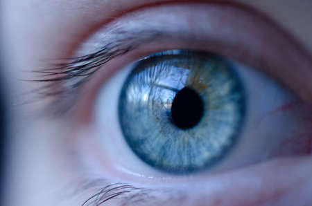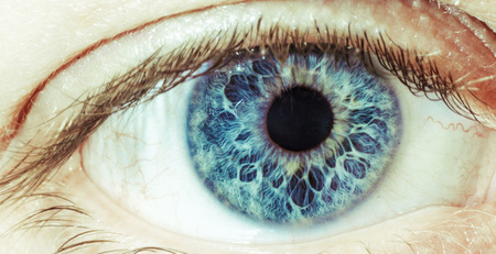 Male blue eye closup super macro background. Selection of glasses and contact lenses concept