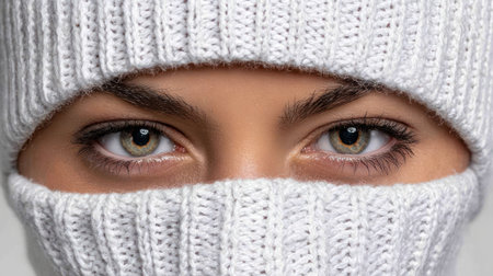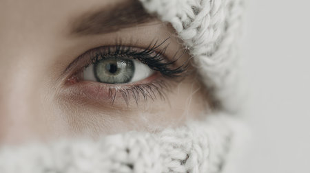 This close-up image features a person's eyes, with the face partially covered by white knitted fabric. The neutral tones of the fabric contrast the eye color, emphasizing the gaze. The lighting is soft and even. This image could be suitable for a variety of editorial or commercial projects.
