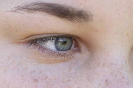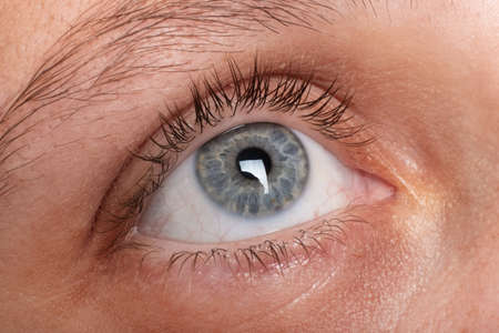 Human Female eye macro. Closeup shot of female gray - blue colour eye with day