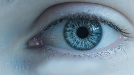 Intense macro shot of a person's eye with detailed textures. Hyper-realistic close-up. Human emotion and vision concept. Design for health brochures, scientific presentations. Macro shot with high detail focus.
