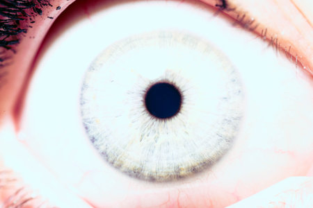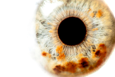 extreme close up of a human eye with reddish dots, shallow depth of field