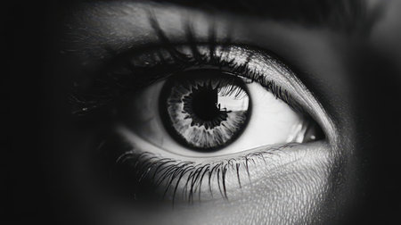 A striking close-up of a person's eye against a dark backdrop, emphasizing intricate details and the depth of human emotion.