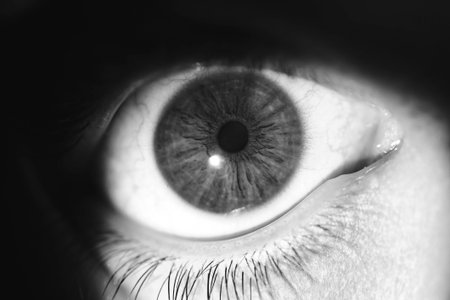 Expressive strong look - closeup of an eye looking sad and empty, high contrast black and white shot