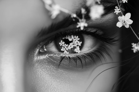 Close-up of a womans eye decorated with delicate flowers, capturing a sense of beauty and nature in monochrome tones. Eye and floral concept.
