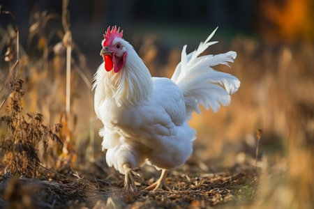 A beautiful white hen walking gracefully on green grass, illuminated by soft golden light during sunset, capturing the essence of nature and tranquility.