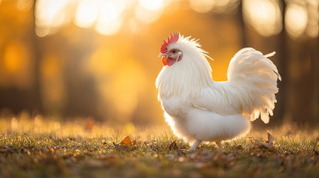 A Silkie chicken with soft white feathers standing on a farm meadow, sunlight casting warm highlights on its fur-like plumage.
