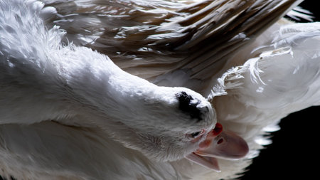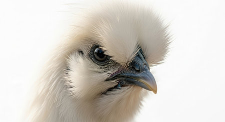 Close-up of a white hen face, sharp details on feathers and beak, isolated with soft lighting.