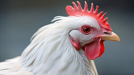 A detailed close-up shot of a white chickens head, showcasing its red comb and wattle, with a blurred background.