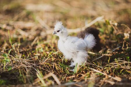Fluffy white silkie farm chicken, looking fabulous, selective focus