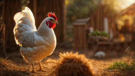 A proud white rooster with a red comb in a rustic barnyard, surrounded by colorful fallen leaves under the warm sunlight. Ideal for farm life or nature story illustrations.