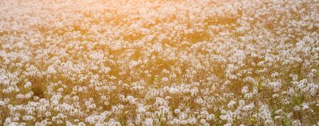 Large field Of dandelion field. Natural grass of fluffy spring dandelions - Taraxacum officinale. Concept of world environment day.