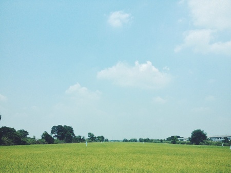 green grass field and blue sky with clouds