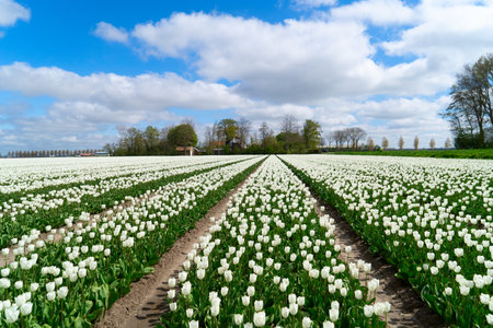 Dutch white tulip field with rows in sunny day with blue sky