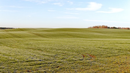 Green, empty, curved meadow with blue sky
