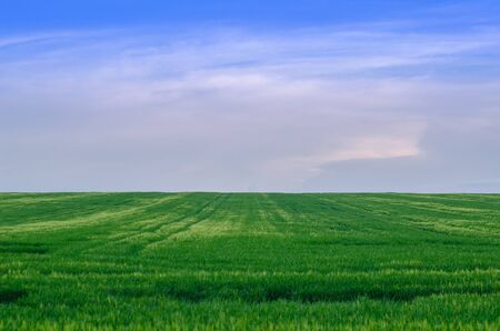 Landscape with sky and field on which crops grow in long rows, spring season