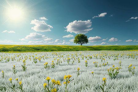 Green meadow with yellow flowers and blue sky. 3d render