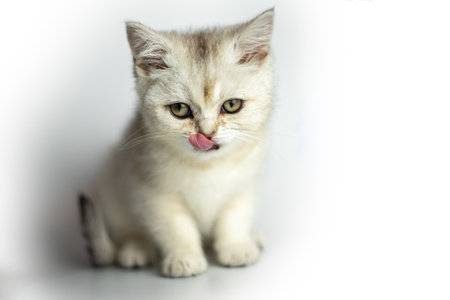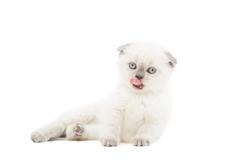 small white gray fluffy kitten british licks on a white background.