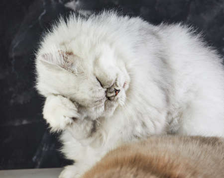 Chinchilla Persian Cat, Silver shade licking his paw for cleaning and grooming itself. Healthy cat