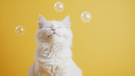 A fluffy white cat blissfully gazes upward as playful bubbles float around against a vibrant yellow backdrop adorned with fish.