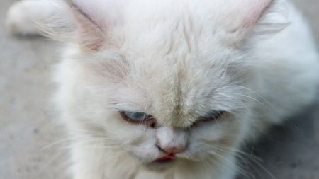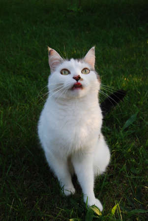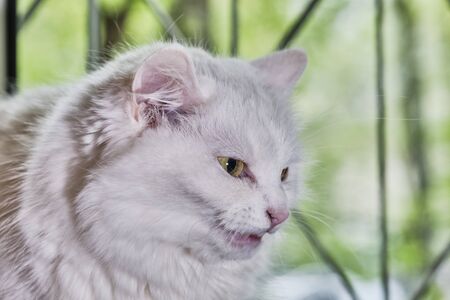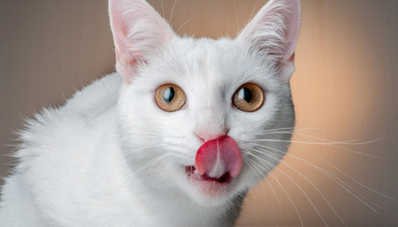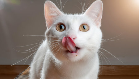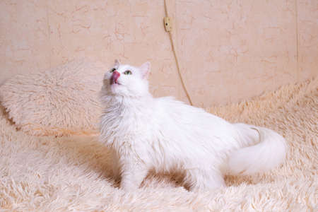 White fluffy cat licks and looking portrait close up